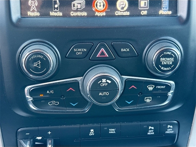 115V Auxiliary Power Outlet, 17`` x 7`` Aluminum Wheels, 4-Wheel Disc Brakes, 40/20/40 Split Bench Seat, 6 Month Trial (Reg. Required), 6 Month Trial (Registration Required), 6 Speakers, 8.4`` Touchscreen Display, ABS brakes, Active Grille Shutters, Air Conditioning, Air Conditioning ATC w/Dual Zone Control, Alloy wheels, AM/FM radio, Anti-Spin Differential Rear Axle, Audio Jack Input for Mobile Devices, Auto-Dimming Exterior Mirrors, Auto-Dimming Rear-View Mirror, Black Exterior Mirrors, Black Rotary Shifter, Brake assist, Bright/Bright Billets Grille, Bumpers: chrome, Center Hub, Charge Only Remote USB Port, Chrome Bodyside Molding, Class IV Receiver Hitch, Cloth 40/20/40 Bench Seat, Compass, Delay-off headlights, Driver door bin, Dual front impact airbags, Dual front side impact airbags, Dual Rear Exhaust w/Bright Tips, Electroluminescent Instrument Cluster, Electronic Shift, Electronic Stability Control, Exterior Mirrors Courtesy Lamps, Exterior Mirrors w/Heating Element, Exterior Mirrors w/Supplemental Signals, Fog Lamps, Folding Flat Load Floor Storage, For Details Visit DriveUconnect.com, Front anti-roll bar, Front Armrest w/3 Cupholders, Front Center Armrest w/Storage, Front Center Seat Cushion Storage, Front reading lights, Front wheel independent suspension, Fully automatic headlights, Glove Box Lamp, GPS Antenna Input, Heated door mirrors, Illuminated entry, Integrated Voice Command w/Bluetooth, Leather Wrapped Steering Wheel, LED Bed Lighting, Lone Star Badge, Lone Star Regional Package, Low tire pressure warning, Media Hub (USB, AUX), Nav-Capable! See Dealer for Details, Occupant sensing airbag, Outside temperature display, Overhead airbag, Overhead console, Overhead Console w/Garage Dr Opener, Panic alarm, ParkSense Front/Rear Park Assist System, ParkView Rear Back-Up Camera, Passenger door bin, Passenger vanity mirror, Power 10-Way Driver Seat, Power door mirrors, Power Heated Fold-Away Mirrors, Power Lumbar Adjust, Power steering, Power windows, Power-Folding Mirrors, Premium Cloth 40/20/40 Bench Seat, Quick Order Package 26R Lone Star (Regional), Radio data system, Radio: Uconnect 3 w/5`` Display, Radio: Uconnect 3C w/8.4`` Display, Rear 60/40 Split Folding Seat, Rear anti-roll bar, Rear Dome w/On/Off Switch Lamp, Rear seat center armrest, Rear step bumper, Remote keyless entry, Remote Start System, Remote USB Port, Security Alarm, SIRIUSXM Satellite Radio, Speed control, Steering Wheel Mounted Audio Controls, Storage Tray, Sun Visors w/Illuminated Vanity Mirrors, Tachometer, Tilt steering wheel, Tip Start, Traction control, Trailer Brake Control, Trip computer, Uconnect Access, Underhood Lamp, Universal Garage Door Opener, Variably intermittent wipers, Voltmeter, Wheels: 20`` x 8`` Aluminum Chrome Clad.