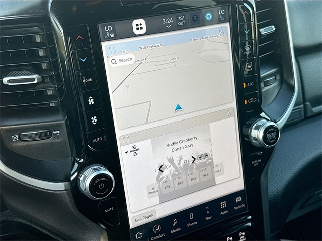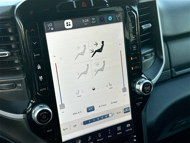 115V Auxiliary Power Outlet, 12`` Touchscreen Display, 2nd Row In Floor Storage Bins, 3 Rear Seat Head Restraints, 3.21 Rear Axle Ratio, 4 Way Front Headrests, 4-Wheel Disc Brakes, 400W Inverter, 48V Belt Starter Generator, 4G LTE Wi-Fi Hot Spot, 6 Speakers, 9 Amplified Speakers w/Subwoofer, ABS brakes, Air Conditioning, Air Conditioning ATC w/Dual Zone Control, All R1 High Radios, All Radio Equipped Vehicles, Alloy wheels, AM/FM radio, Anti-Spin Differential Rear Axle, Apple CarPlay, Auto-Dimming Exterior Driver Mirror, Auto-Dimming Rear-View Mirror, Big Horn Level B Equipment Group, Black Exterior Mirrors, Black Premium Power Mirrors, Brake assist, Bumpers: chrome, Class IV Receiver Hitch, Cloth Bench Seat, Cluster 7.0`` TFT Color Display, Compass, Connected Travel & Traffic Services, Connectivity - US/Canada, Convex Wide-Angle Exterior Mirror Insert, Delay-off headlights, Disassociated Touchscreen Display, Driver door bin, Dual front impact airbags, Dual front side impact airbags, Electronic Stability Control, Emergency communication system: SiriusXM Guardian, Exterior Mirrors Courtesy Lamps, Exterior Mirrors w/Heating Element, Exterior Mirrors w/Supplemental Signals, For Details, Visit DriveUconnect.com, For More Info, Call 800-643-2112, Front anti-roll bar, Front Center Armrest w/Storage, Front Fog Lamps, Front License Plate Bracket, Front reading lights, Front Seat Back Map Pockets, Front wheel independent suspension, Fully automatic headlights, Global Telematics Box Module (TBM), Glove Box Lamp, Google Android Auto, GPS Antenna Input, GPS Navigation, HD Radio, Heated door mirrors, Heated Front Seats, Heated Steering Wheel, Illuminated entry, Integrated Center Stack Radio, Integrated Voice Command w/Bluetooth, Leather steering wheel, LED Footwell Lighting, Lone Star Badge, Low tire pressure warning, Manufacturer`s Statement of Origin, Media Hub w/2 Charge Only USBs, MOPAR Front & Rear Rubber Floor Mats, Occupant sensing airbag, Outside temperature display, Overhead airbag, Overhead console, Panic alarm, ParkSense Front/Rear Park Assist w/Stop, ParkView Rear Back-Up Camera, Passenger door bin, Passenger vanity mirror, Power 2-Way Driver Lumbar Adjust, Power 8-Way Driver Seat, Power Adjustable Pedals, Power door mirrors, Power steering, Power windows, Power-Folding Mirrors, Quick Order Package 27R Lone Star (Regional), Radio data system, Radio: Uconnect 3 w/5`` Display, Radio: Uconnect 5 Nav w/12.0`` Display, RAM Grille Badge - Chrome, Rear 60/40 Folding Seat, Rear anti-roll bar, Rear Dome w/On/Off Switch Lamp, Rear Power Sliding Window, Rear seat center armrest, Rear step bumper, Rear Window Defroster, Remote keyless entry, Remote Start System, Security Alarm, SiriusXM Radio Service, SiriusXM Satellite Radio, SiriusXM w/360L, Speed control, Split folding rear seat, Steering wheel mounted audio controls, Sun Visors w/Illuminated Vanity Mirrors, Tachometer, Telescoping steering wheel, Tilt steering wheel, Traction control, Trip computer, Universal Garage Door Opener, USB Host Flip, Variably intermittent wipers, Voltmeter, Wheels: 18`` x 8`` Cast-Aluminum Painted, Wheels: 20`` x 9`` Aluminum Chrome Clad (WRK).