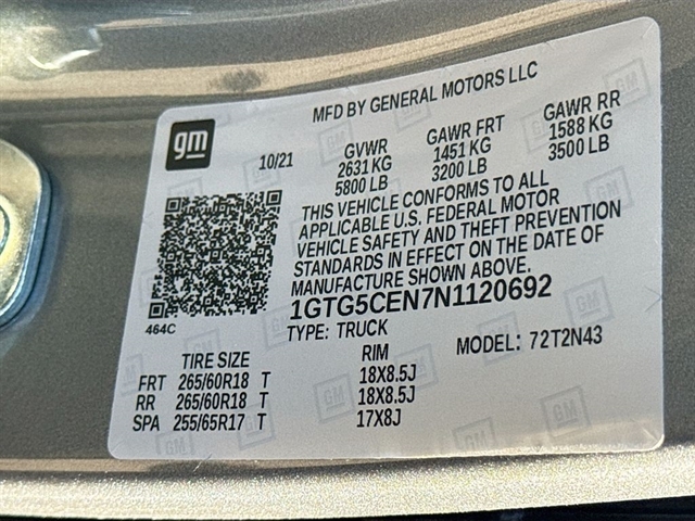 3.42 Rear Axle Ratio, 4-Wheel Disc Brakes, 4.10 Rear Axle Ratio (DISC), 6 Speakers, 6-Speaker Audio System Feature, ABS brakes, Air Conditioning, Alloy wheels, AM/FM radio: SiriusXM, Apple CarPlay/Android Auto, Auto-dimming Rear-View mirror, Automatic Locking Rear Differential, Automatic temperature control, Bumpers: body-color, Cloth Seat Trim, Compass, Delay-off headlights, Driver 6-Way Power Seat Adjuster, Driver door bin, Driver vanity mirror, Dual front impact airbags, Dual front side impact airbags, Electronic Stability Control, Emergency communication system: OnStar and GMC Connected Services capable, Exterior Parking Camera Rear, Front anti-roll bar, Front Bucket Seats, Front Center Armrest, Front fog lights, Front License Plate Kit, Front reading lights, Front wheel independent suspension, Fully automatic headlights, Heated door mirrors, Hitch Guidance, Illuminated entry, Low tire pressure warning, Occupant sensing airbag, Outside temperature display, Overhead airbag, Overhead console, Panic alarm, Passenger door bin, Passenger vanity mirror, Power door mirrors, Power driver seat, Power steering, Power windows, Preferred Equipment Group 2LE, Premium audio system: GMC Infotainment System, Radio data system, Radio: AM/FM w/8`` Diagonal Color Touch-Screen, Rear reading lights, Rear seat center armrest, Rear step bumper, Rear window defroster, Remote keyless entry, Security system, SiriusXM Radio, Speed control, Speed-sensing steering, Steering wheel mounted audio controls, Tachometer, Telescoping steering wheel, Tilt steering wheel, Tow/Haul Mode, Traction control, Trailering Package, Trip computer, Variably intermittent wipers, Wheels: 18`` x 8.5`` Black Painted Aluminum.