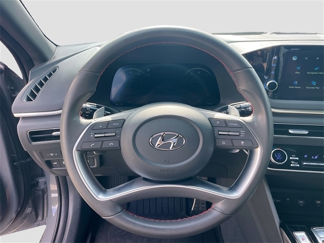 Black Artificial Leather, 12 Speakers, 19`` x 8.0J Aluminum Alloy Wheels, 4-Wheel Disc Brakes, ABS brakes, Air Conditioning, Alloy wheels, AM/FM radio: SiriusXM, Apple CarPlay & Android Auto, Auto High-beam Headlights, Auto-dimming Rear-View mirror, Automatic temperature control, Brake assist, Bumpers: body-color, Cargo Tray, Carpeted Floor Mats, Delay-off headlights, Driver door bin, Driver vanity mirror, Dual front impact airbags, Dual front side impact airbags, Electronic Stability Control, Emergency communication system: Blue Link Connected Car Service (3-year complimentary subscription), Exterior Parking Camera Rear, Four wheel independent suspension, Front anti-roll bar, Front Bucket Seats, Front Center Armrest, Front dual zone A/C, Front reading lights, Fully automatic headlights, Heated door mirrors, Heated Front Bucket Seats, Heated front seats, Illuminated entry, Knee airbag, Leather steering wheel, Leatherette/Suede Combination Seating Surfaces, Low tire pressure warning, Navigation System, Occupant sensing airbag, Option Group 01, Outside temperature display, Overhead airbag, Overhead console, Panic alarm, Passenger door bin, Passenger vanity mirror, Power door mirrors, Power driver seat, Power moonroof, Power steering, Power windows, Radio data system, Radio: AM/FM/MP3/HD/SiriusXM Display Audio w/Nav, Rear anti-roll bar, Rear Bumper Applique, Rear seat center armrest, Rear side impact airbag, Rear window defroster, Remote keyless entry, Security system, Speed control, Speed-sensing steering, Speed-Sensitive Wipers, Split folding rear seat, Steering wheel mounted audio controls, Tachometer, Telescoping steering wheel, Tilt steering wheel, Traction control, Trip computer, Trunk Cargo Net, Turn signal indicator mirrors, Variably intermittent wipers, Black Artificial Leather. Recent Arrival!